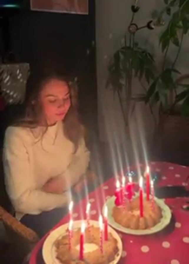 A woman is seated at a table with two cakes, each adorned with several lit candles, in a dimly lit room. The cakes are round with a hole in the middle. She is wearing a light-colored sweater and is positioned directly in front of the cakes, blowing out the candles. The table is covered with a red and white polka dot tablecloth. Behind her are a houseplant and a piece of wall art. There is a disco ball reflecting light onto the wall.