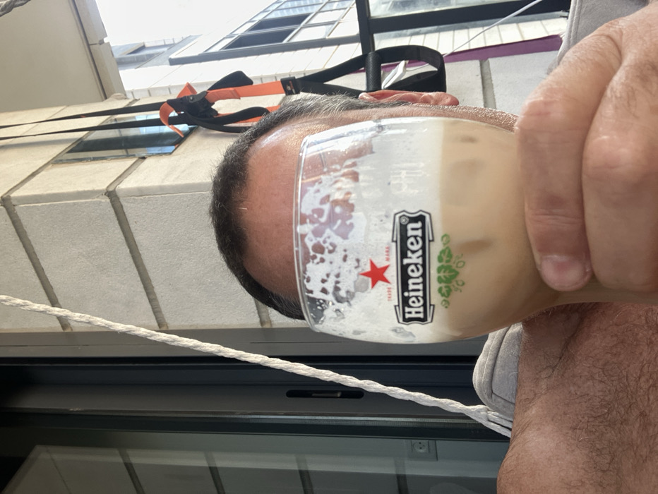 The image depicts a male subject on an outdoor balcony in Givatayim, Israel, holding a branded glass that obscures most of his face. The glass, displaying the "Heineken" logo with a red star and green leaves, contains a frothy, light-brown, iced beverage. The subject's forehead is visible above the glass, showing minor perspiration; his dark hair and a hairy left shoulder are partially discernible. To the left, a white braided rope hangs vertically, adjacent to a dark-framed glass door or window, with a white electrical outlet visible on the wall nearby. To the right, a light-colored, block-patterned exterior wall forms part of the immediate building structure. Black and orange suspension training straps hang from an unseen fixture in the upper right. A multi-story building is faintly visible in the distant background. The scene is brightly illuminated by natural daylight.