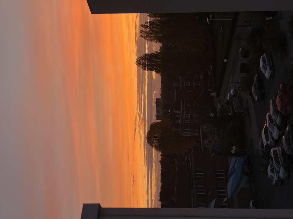 The image displays an elevated urban landscape view in Villeneuve-d'Ascq, France, captured during sunset. The sky occupies approximately two-thirds of the frame, exhibiting a gradient from vibrant orange and red at the horizon, transitioning to lighter orange and a muted purplish-gray towards the top, with horizontal stratiform cloud formations. Obstructing the immediate foreground on the left and right are partial white/light gray concrete structures, indicating the vantage point is from within a building or balcony. Below the horizon, the city is largely silhouetted, presenting a dense arrangement of multi-story buildings with dark facades and roofs. A tall, lighter-toned high-rise building is discernible on the distant horizon near the center. Clusters of trees, some with visible foliage, are distributed throughout the mid-ground, including a large, rounded tree canopy on the left and several slender trees on the right. On a building in the lower-left quadrant, a colorful mural depicting two stylized faces is present, along with a large blue and white striped fabric covering its lower section. The lower portion of the image depicts a street-level area. A parking lot on the left contains approximately 10-15 parked passenger vehicles of various models and colors. A road traverses horizontally across the scene, with several additional vehicles either parked or in motion. Multiple streetlights are visible but do not emit significant illumination. No human figures are identified within the frame.
