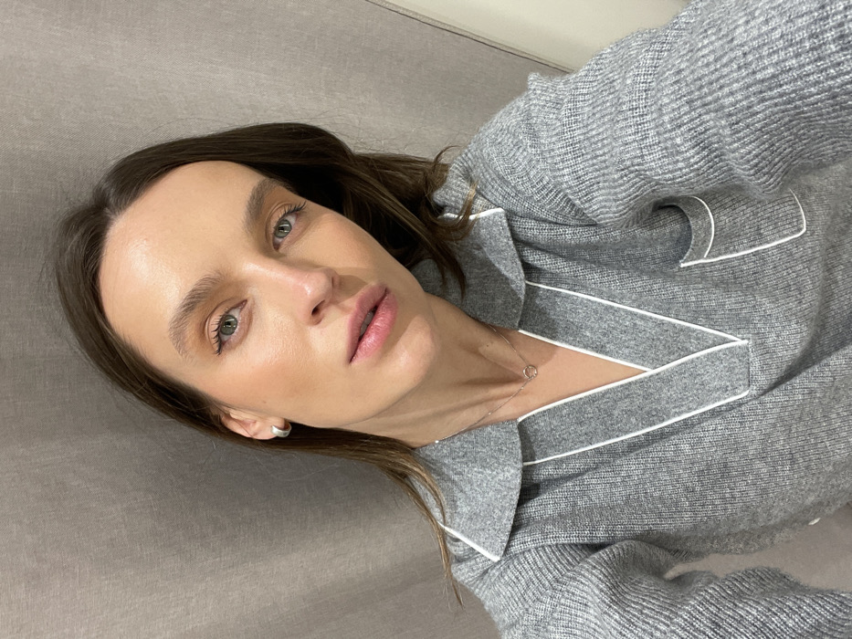A woman with light skin, brown hair, and green eyes, wearing a gray pajama top with white trim, looks towards the camera in a selfie
