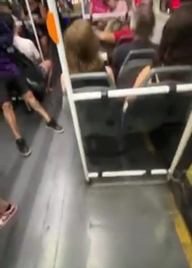 inside of a bus at night. The camera starts focused on the floor and the legs of the person holding the camera. The camera then pans up to show other passengers sitting and standing. Some passengers are looking at their phones, while others are talking. The bus is moving, and the lights from passing cars can be seen through the windows.