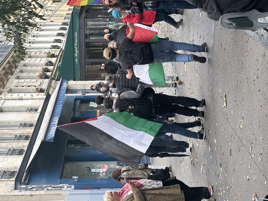 The image captures a street scene on Rue des Panoyaux in the 20th arrondissement of Paris, France. The location is identifiable by the prominent storefronts "Librairie L'Acacia" under a blue awning and "Au Royal Couscous" under a green awning, both situated on classic Parisian stone buildings. The environment suggests an overcast day, with numerous fallen autumn leaves scattered across the asphalt street surface. Approximately twenty individuals are visible, mostly adults of diverse ages. In the foreground, a person faces away from the camera, carrying a large Palestinian flag (black, white, green horizontal stripes with a red triangle on the hoist side). A second, smaller Palestinian flag is carried by another person further into the scene. A man is observed carrying a small child on his shoulders. On the far right edge, a portion of a rainbow flag is visible. Most individuals are dressed in casual attire, including jackets, jeans, and sneakers; several backpacks are also noted. An individual on the left side of the frame is looking at a mobile phone. A closed black umbrella is held by one person in the mid-ground. A metal barrier or structure is partially visible in the bottom right corner. People are either walking or standing, forming a loose gathering.