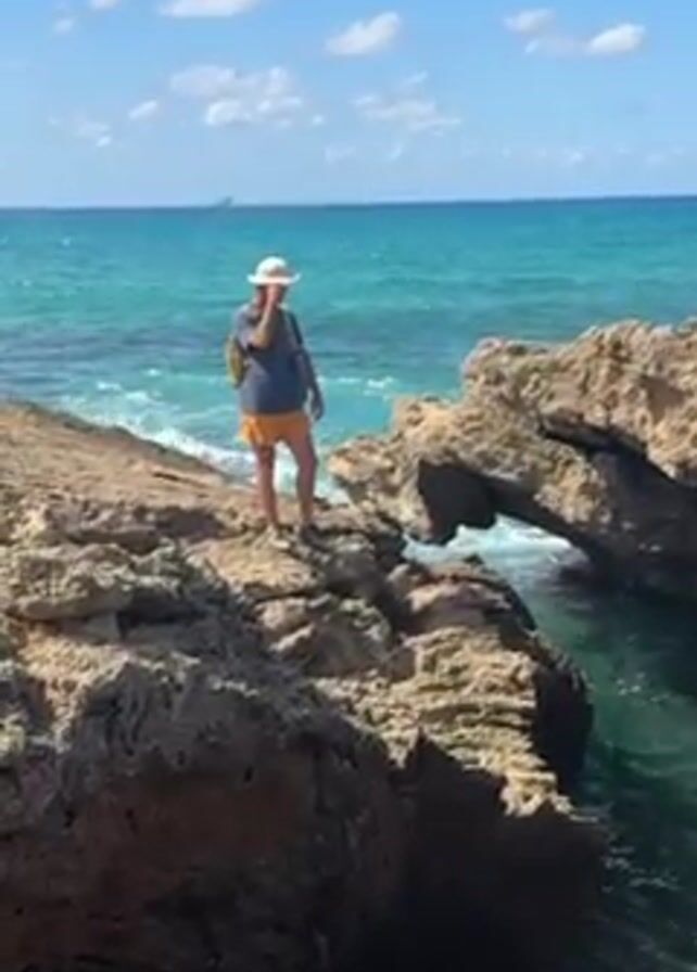 person standing on rocks by the ocean. The person is wearing a hat, t-shirt, orange shorts, and a backpack. They are standing on a rocky outcrop with a natural archway formed by the rocks. The ocean is turquoise and there is a ship visible in the distance. The sky is blue with some clouds. The person is looking down at the rocks.