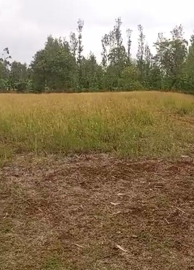The camera pans across a rural landscape, beginning with a field of tall, golden grass bordered by trees and a hedge. A dirt path runs along the edge of the field. The camera then moves to reveal a cleared patch of land with sparse grass and exposed soil. As the camera pans further, a road appears in the distance, with buildings and vehicles visible along it. A mountain can be seen in the background, and the sky is overcast.