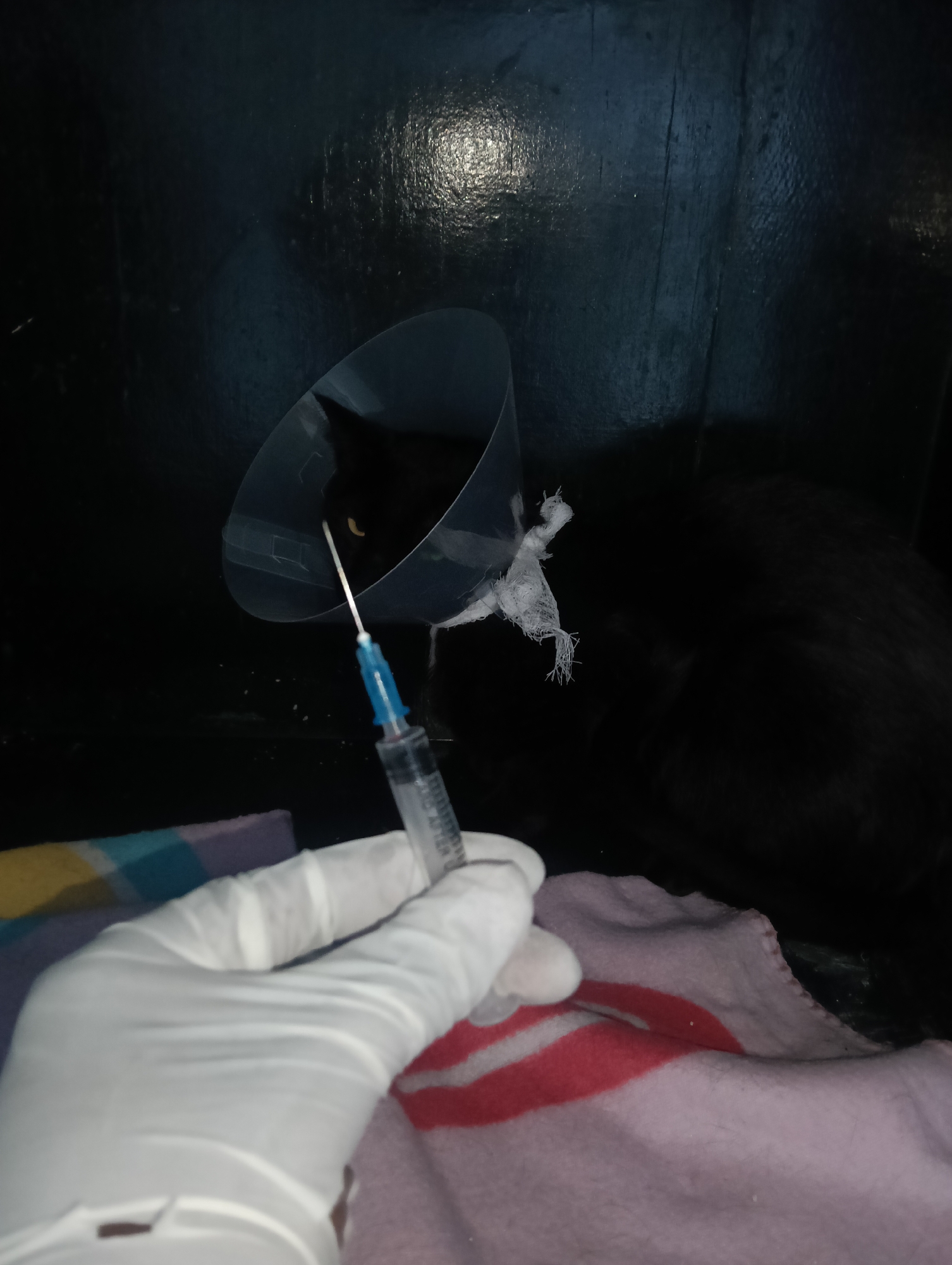 A dark, indoor space features a black cat wearing a clear plastic cone of shame. A gloved hand holds a syringe towards the cat. The cat's fur is mostly black, with one visible yellow eye. The cone is partially taped with white gauze. The hand is wearing a white latex glove and holds a clear plastic syringe with a blue needle. The background is a dark, possibly painted, wall. A multi-colored blanket and a pink blanket with red markings are visible beneath the hand. The location is unknown; there is no information to suggest this scene occurred in Nairobi, Kenya.