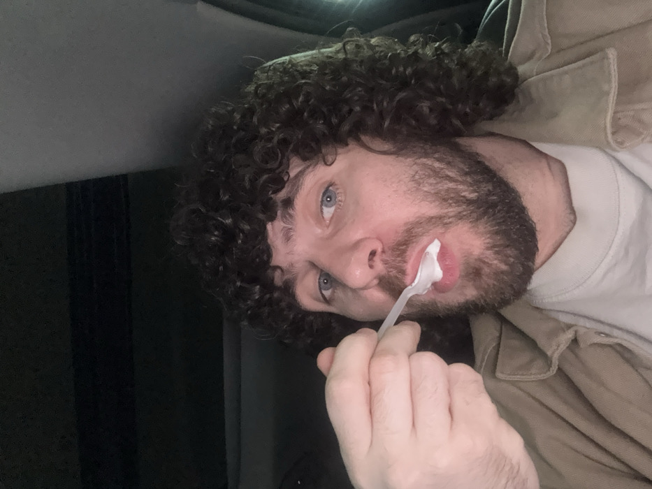 A male subject, with dark curly hair, blue eyes, and a full beard, is depicted in a close-up view from the chest up. He is seated within what appears to be a vehicle interior, evident from the dark headliner visible above. The subject wears a light-colored, possibly off-white, t-shirt under a light brown or tan collared jacket. His left hand holds a translucent white plastic spoon containing a white substance, positioned at his mouth as if actively consuming it. The subject maintains direct eye contact with the camera. The background outside the vehicle is uniformly dark, indicative of low light conditions or night. No visual cues within the image permit identification of a specific location in the city of Pushkino, Russia.