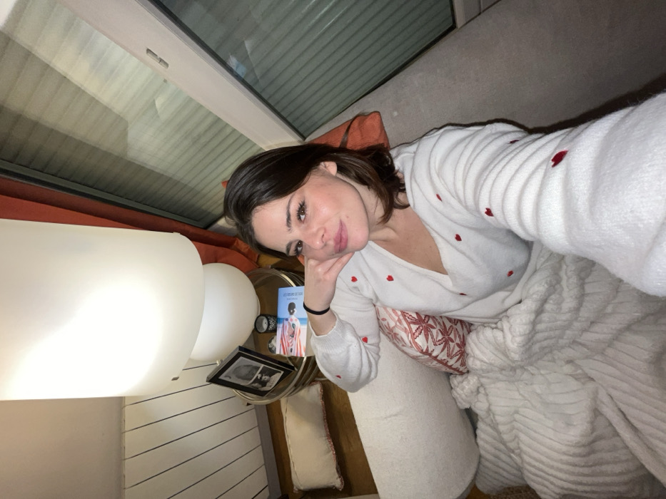 A woman rests on a couch under a white blanket, wearing a white, heart-patterned sweater. An orange pillow is behind her. A table beside the couch holds a lamp, a photo frame, a small can, and a book titled "Les Soeurs de Soleil." The background shows a window and the roof. The picture is a selfie.