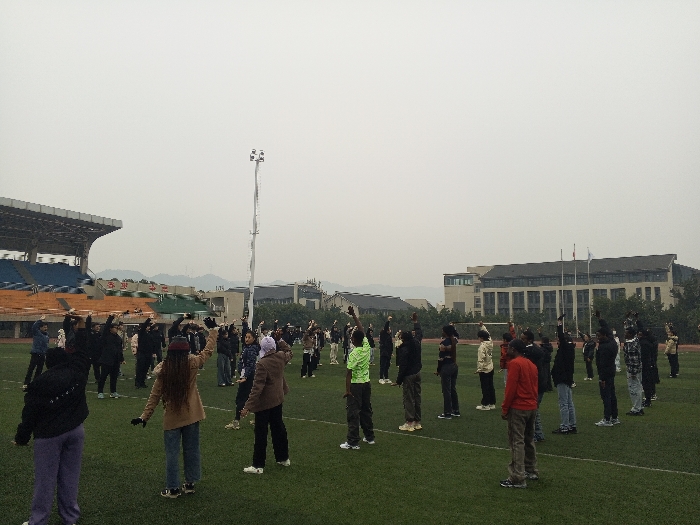 A large group of people stand on a green field, likely a sports field, in what appears to be a workout or stretching session. Most have their arms raised. The background includes a stadium with blue seating, a light pole, and several buildings. The sky is overcast, creating a muted light. The attire of the people is casual, with a variety of clothing styles and colors.