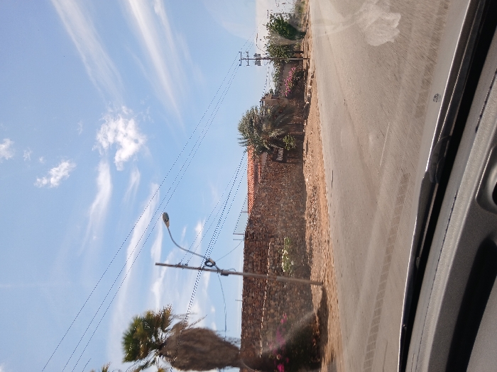 This image captures a sunlit street scene in La Guardia, Venezuela, viewed from within a vehicle. The foreground shows a dark grey vehicle dashboard and the lower edge of a windshield, partially obscuring the immediate road surface. The mid-ground features a paved asphalt road, appearing dry and without visible lane markings. No vehicles or pedestrians are present on the road. The background primarily consists of a property boundary on the right. This boundary is marked by a low wall constructed from stacked, reddish-brown stones. Behind the wall, a building with a reddish-tiled roof is partially visible. A dark sign with white lettering, possibly reading "MARINA," is affixed to the wall. Scattered vegetation, including a prominent, tall palm tree on the far left, other smaller palm trees, and shrubs bearing pink flowers, lines the property and extends into the background. The ground beside the road and property appears dry and dusty. Overhead, multiple black utility lines traverse the frame horizontally, connecting to several utility poles. One grey utility pole with a curved street lamp is prominent on the left, near the palm tree. The sky is bright blue with scattered, wispy white clouds. The overall lighting suggests a clear, sunny day. No people or active interactions are discernible within the frame.