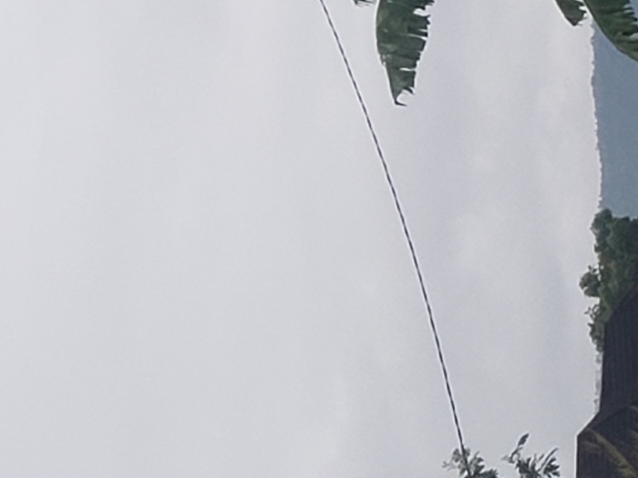 The image captures an outdoor scene in Adonkolo, Nigeria, under an overcast, light gray sky. A dark, thin cable or wire extends horizontally across the middle of the frame, showing a slight sag. In the lower left, the peak of a dark-brown or reddish-brown roof is visible, partially covered by green tree foliage. In the lower right, several large, green, tattered leaves, indicative of a banana plant, are partially visible. A distant horizon reveals a line of trees and faint, undulating outlines of hills or mountains beneath the sky. No individuals or direct human actions are depicted.