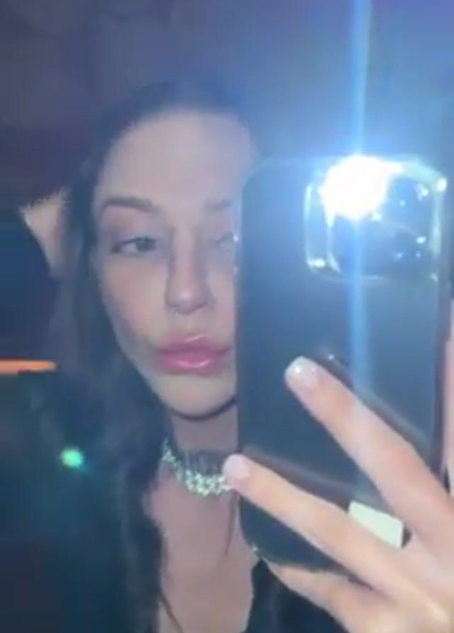 A young woman takes a selfie in a bathroom. She holds her phone in her right hand and adjusts her hair with her left. She is wearing a black top, a diamond-studded choker, and has long, dark hair in braids. The bathroom has red walls with a patterned mural. The phone's flash is on, creating a bright glare in the image. The music playing in the background is dance music.