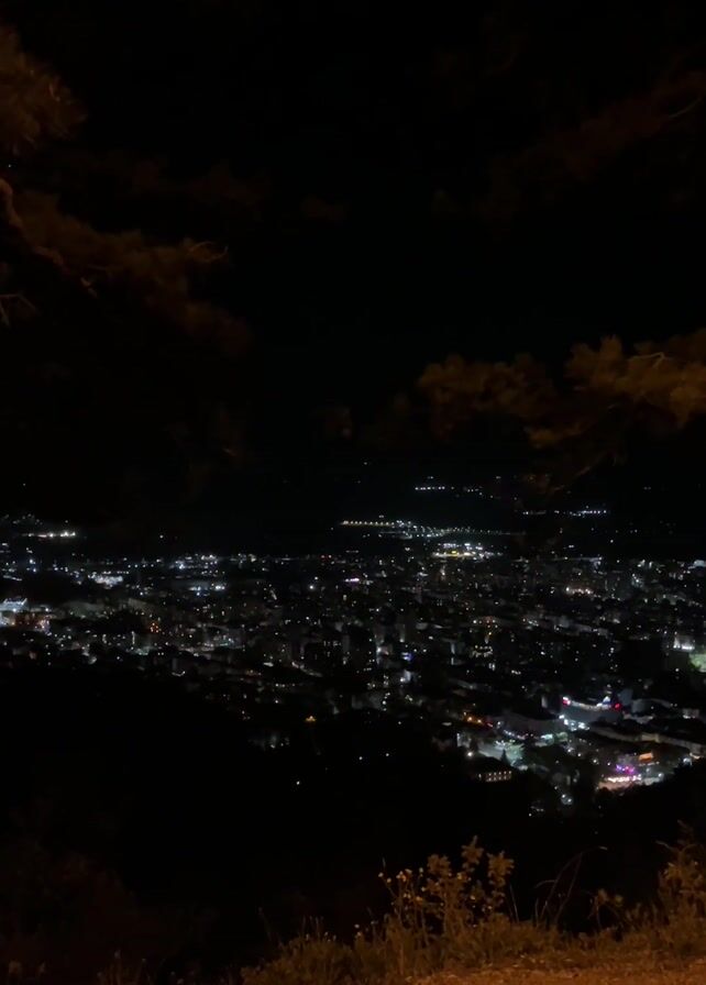 night view of a city from an elevated perspective. The city is illuminated by numerous lights, scattered across the urban landscape. The sky above is dark, with some scattered clouds. In the foreground, there is a dirt ground area with some vegetation, including grass and small plants. A tree is visible on the right side of the frame. The overall scene is dark, but the city lights provide contrast and visual interest.
