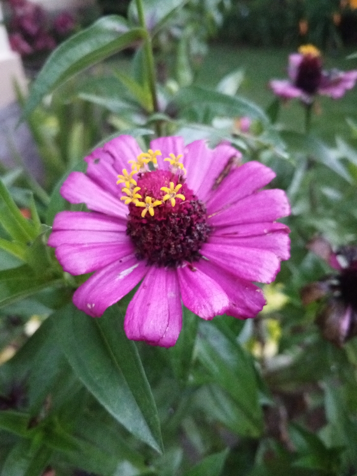 A close-up photograph captures a Zinnia flower, situated in what appears to be a garden in Catarman, Philippines. The primary subject is a magenta-colored Zinnia flower, centrally positioned in the frame, featuring numerous petals surrounding a prominent dark reddish-brown central disc. Several small, bright yellow, star-shaped structures emerge from the top of the central disc. The petals exhibit minor irregularities, including small nicks along their edges. Surrounding the main flower are blurred green leaves and other indistinct plant elements, including additional faint magenta flowers in the background. No individuals, animals, or specific actions are discernible within the frame.