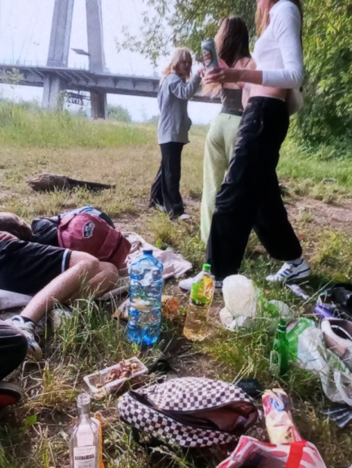 This image depicts an outdoor gathering of four young individuals on a grassy bank near the Odra River in Wrocław, Poland, with the Rędziński Bridge prominently visible in the background. In the foreground, a person lies partially visible on their back on the ground, wearing a black shirt and white sneakers. A red backpack is positioned near their head. Surrounding this individual on the dry grass are numerous items: a large blue plastic bottle of water, a white styrofoam tray containing small cooked food items, an open black and white checkered backpack, a black JBL portable speaker, a yellow plastic bottle, a white crumpled plastic bag, a green glass bottle, a partially empty clear glass bottle with a white label (identified as Żytnia vodka), and other miscellaneous discarded packaging and items. In the middle ground, three individuals are standing. On the left, a female with blonde hair, wearing a grey hooded sweatshirt and dark pants, faces towards the center. Next to her, a female with dark hair, wearing a dark top and light green wide-leg pants, holds a tall metallic can. To her right, a third female with light hair, dressed in a white long-sleeved crop top, dark wide-leg pants, and white Adidas sneakers, stands facing partially towards the center. The background is dominated by the grey concrete pylons and suspension cables of the Rędziński Bridge, a cable-stayed bridge. Green foliage and trees line the right side of the image and extend beneath the bridge structure. The ground consists of dry grass and patches of bare earth. A fallen log is visible on the ground to the left of the foreground subjects. The lighting suggests daytime conditions.