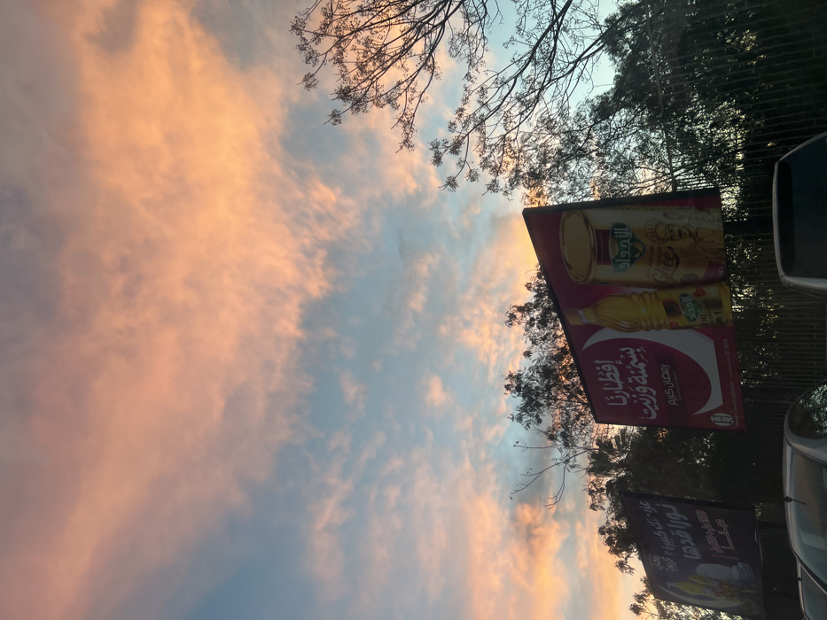 The image depicts an urban street scene in Rukn ad-Din Municipality, Syria, captured during either sunrise or sunset. The upper two-thirds of the frame are dominated by a sky displaying cirrus and stratocumulus clouds illuminated with hues of pastel blue, soft pink, and vibrant orange. Below the sky, dense tree foliage, predominantly dark green, creates a natural backdrop. Two commercial billboards are prominently featured. The larger billboard on the right has a red background and displays an advertisement for "الأجداد" (Al-Ajdad) brand cooking oil (in a clear bottle) and ghee (in a golden can), accompanied by Arabic text and "Ramadan Kareem" in smaller English script. A smaller, darker billboard, partially obscured by trees, is visible to the left, featuring Arabic text and an image of what appears to be a light fixture or kitchenware. The lower portion of the image shows the upper sections of multiple parked or stationary vehicles, indicating a street or parking area. No individuals are visible.
