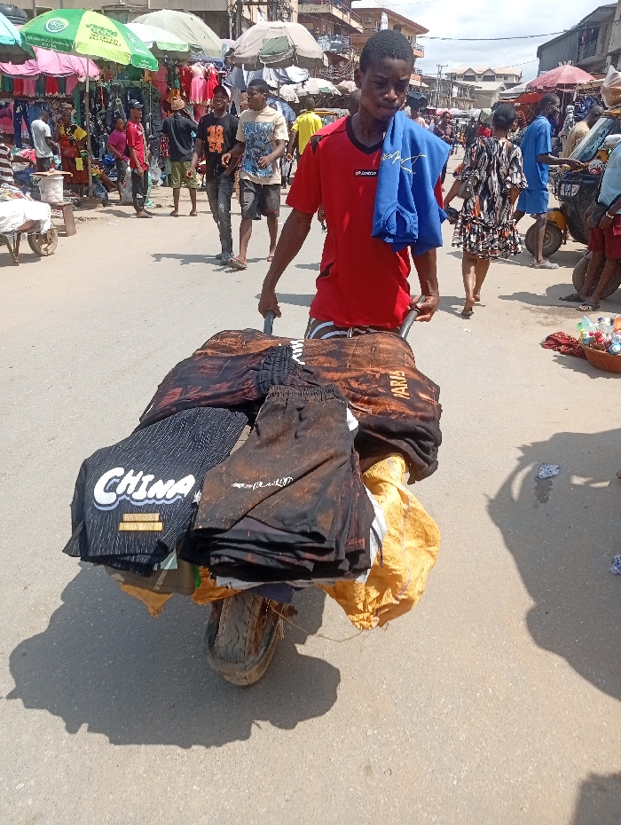 A young male, estimated to be between 15 and 25 years old, is pushing a single-wheel handcart (wheelbarrow) laden with folded clothing items along a paved street in Fegge, Nigeria