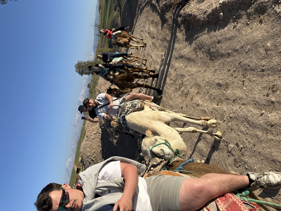 - "A group of seven individuals is engaged in a camel trek on a dirt path in Lalla Takarkoust, Morocco, under a clear, light blue sky" by FM-uegzv2, licensed under CC BY 4.0