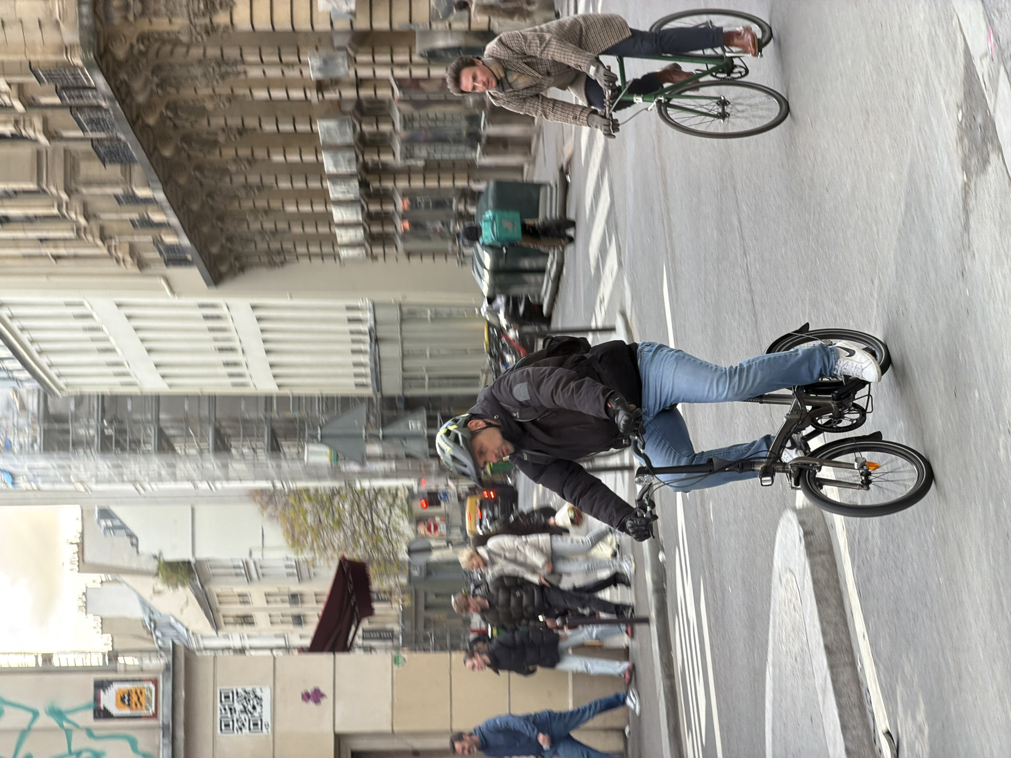 street scene in Paris, France. Two men are riding bicycles on a street lined with buildings. One man is wearing a plaid coat and riding a green bicycle. The other man is wearing a black jacket, blue jeans, a helmet, and white shoes, and riding a black folding bicycle. A group of people are walking on the sidewalk. In the background, there are buildings with intricate architectural details. Street furniture, including a delivery container, is visible on the sidewalk. The pavement of the street is marked with white lines.