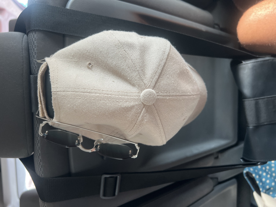 A beige baseball cap rests on a pair of silver-framed sunglasses