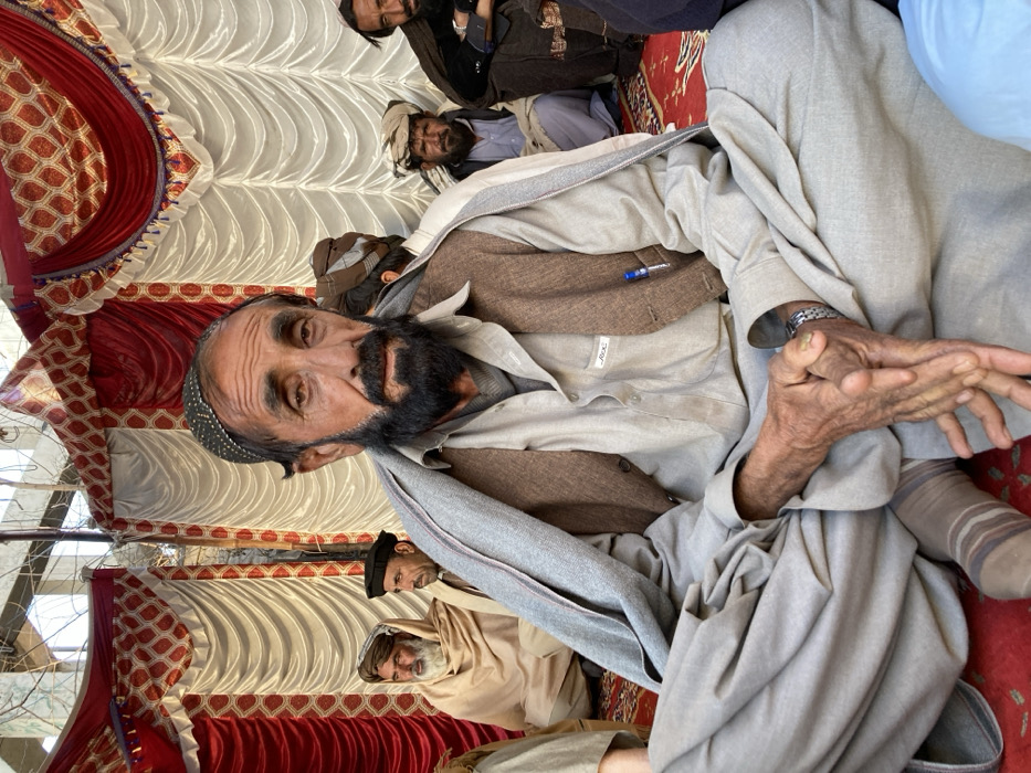 An outdoor scene in Quetta City Tehsil, Pakistan, depicts several men seated on a red patterned carpet under a temporary canopy