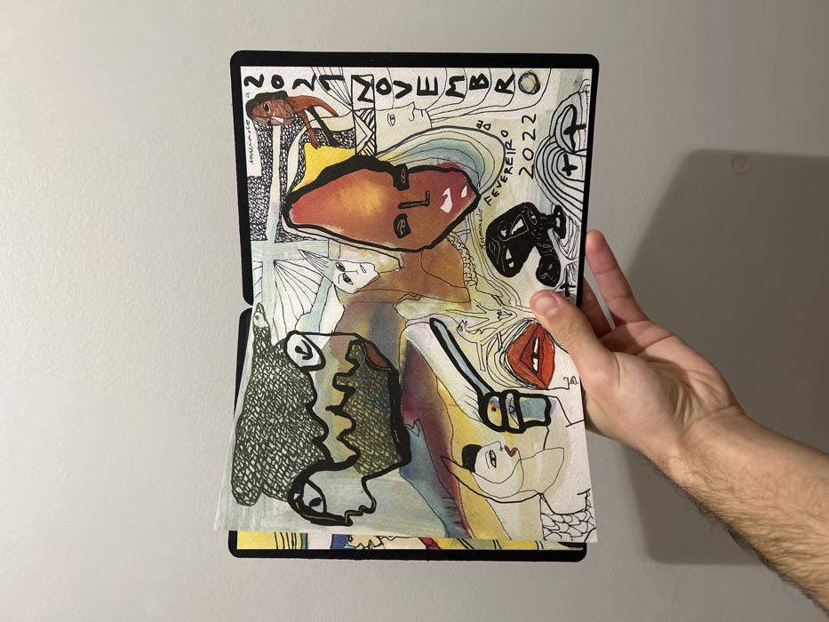 A hand holds open a sketchbook with abstract art in muted watercolor tones and dark line drawings. The art includes various faces, some geometric shapes, and text in Portuguese, including months "Novembro" and "Fevereiro" and the year "2022". The sketchbook has black binding and is held against a plain, light-colored wall. The visible hand has pale skin and short hair on the wrist.