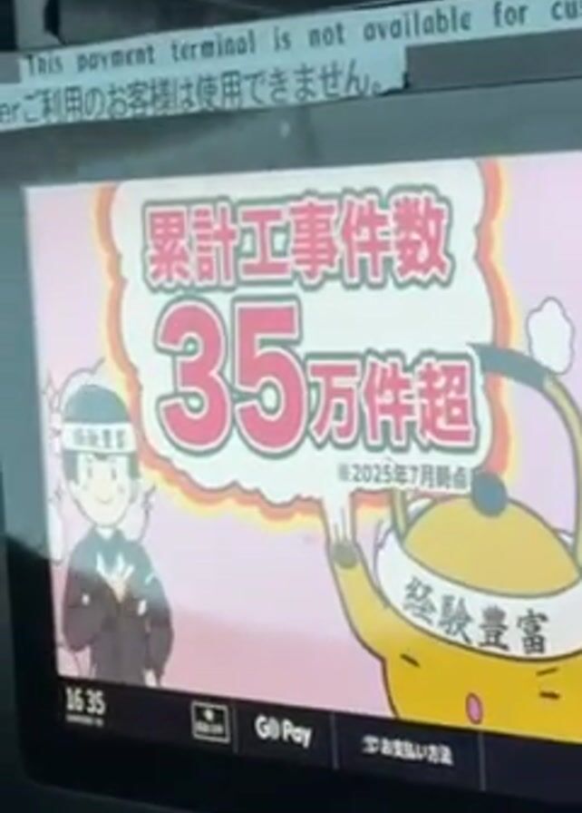 close-up of a digital display. The screen displays promotional images and text in Japanese. A message at the top of the screen indicates that the payment terminal is not available for customers in English and Japanese. The promotional content features cartoon characters and text, with phrases like "Speed construction" and "Free 10-year guarantee." The time on the screen is 16:35.