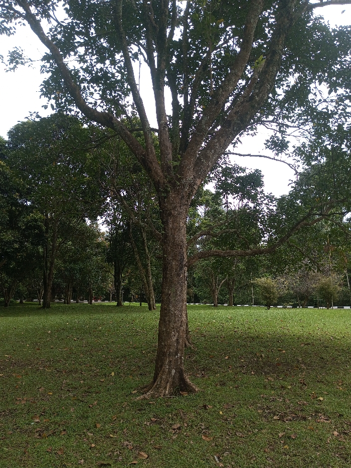 A verdant park setting features a large tree in the foreground with a rough, textured trunk and spreading branches. Lush green grass covers the ground, scattered with fallen leaves. In the background, a row of trees lines the edge of the park, creating a dense, leafy backdrop. The sky is overcast, casting a soft, diffused light over the scene.