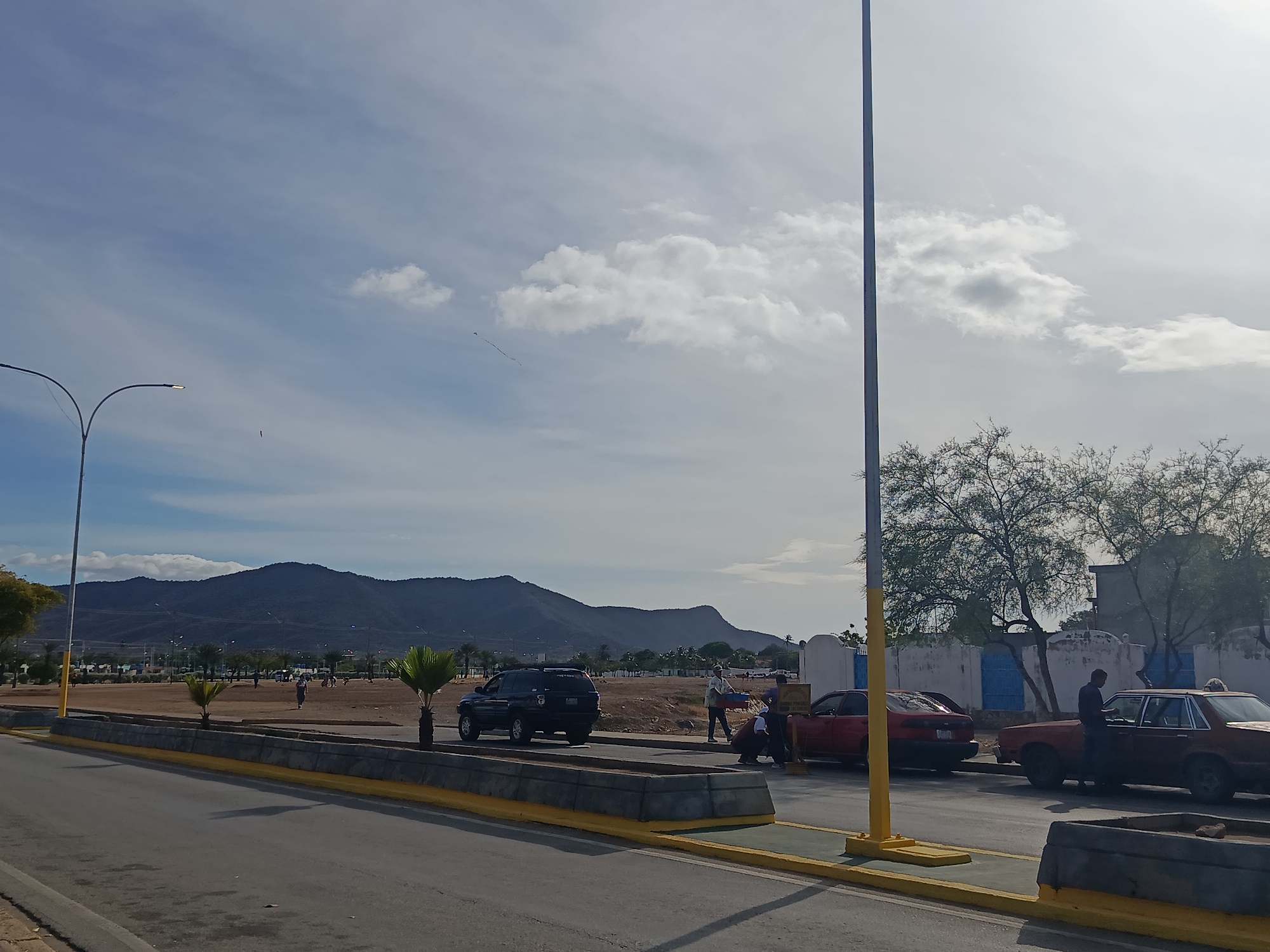 The scene depicts a sunny day in Juan Griego, Venezuela, with a view of a street bordered by a low concrete barrier with a yellow edge. Behind the barrier is a dusty open area with scattered small palm trees and a few people in the distance. A dark SUV is parked in this area. Further back, a mountain range is visible under a cloudy sky. To the right of the frame, several parked cars are observed: a red car, another red car, and a brown car. A person is standing by the brown car, seemingly interacting with it. Another person is standing between the red cars. A tall, slender light pole is located near the parked vehicles. Trees partially obscure a building painted with blue doors behind the vehicles. In the foreground, there is a paved road that appears to be the main street. Another streetlight is seen on the left side of the street.