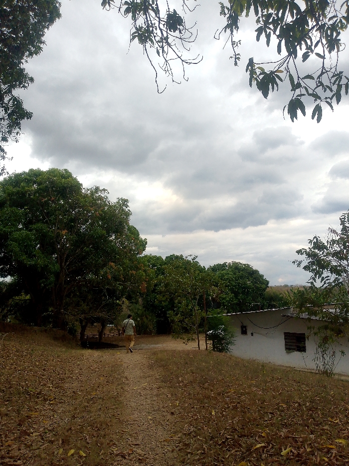 This image depicts a rural or semi-rural outdoor scene in Los Leoncitos, Venezuela, under an overcast sky. The ground in the foreground and mid-ground is dry earth covered with a significant accumulation of reddish-brown fallen leaves and sparse dry vegetation. A distinct dirt path, lighter in color than the surrounding ground, extends from the lower center of the frame, curving slightly left into the middle distance. One individual, an adult male, is visible from behind, walking away from the camera on this path. He is wearing a light-colored horizontally striped shirt and light-colored pants, with dark shoes. To the left of the path, a large tree with dense green foliage stands prominently, exhibiting some clusters of reddish-brown material, possibly fruit or flowers. Further trees with green foliage line the middle ground, forming a dense natural barrier. On the right side of the image, a single-story white or light-colored building with a dark, possibly corrugated, roof is visible. The building features at least one dark, horizontally slatted window shutter and an exterior-mounted dark-colored utility box with visible wiring. Sparse shrubs and small trees grow near the building. The upper portion of the frame is dominated by a grey, cloudy sky. Dark green tree branches with leaves frame the sky from the upper left and upper right corners. In the far background, behind the line of trees and the building, a light-colored, possibly hilly or mountainous, landscape is faintly discernible beneath the cloudy horizon.