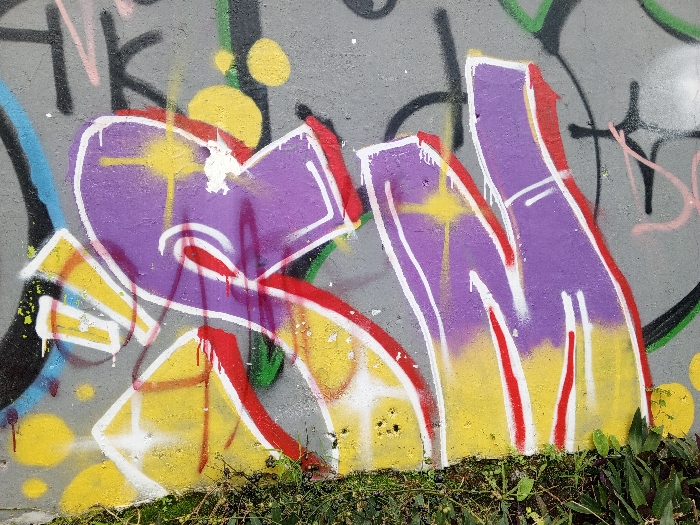 In the city of Voa Yeav, Cambodia, a section of a textured gray concrete wall is depicted, extensively covered with spray-painted graffiti. The central and most prominent element is a stylized, two-letter graffiti tag, possibly representing "SM" or similar characters. This tag features purple coloring in its upper sections, transitioning to yellow in its lower parts, outlined distinctly in white, and accented with red drop shadows and paint drips, particularly from the red and purple areas. Behind and around this central tag, various other indistinct graffiti markings are visible in black, green, light blue, and pink. The wall's surface exhibits some minor wear and paint flaking. At the very bottom of the wall, a line of dense green vegetation, including small leafy plants and weeds, grows along the base. No individuals or direct actions are depicted in the scene.