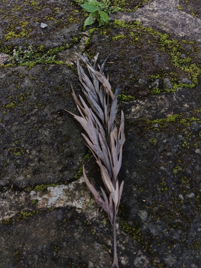 - "A single, desiccated plant stalk, approximately 15-20 cm in length, with withered, pointed leaves ranging from faded brown to dark grey, is centered vertically on a dark, uneven surface" by FM-B2GCN2, licensed under CC BY 4.0