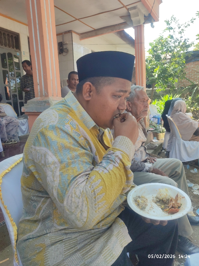 A man wearing a black peci and a yellow patterned shirt is eating from a white plate. He sits on a white chair with a yellow trim. Next to him sits an older man in a light-colored shirt. Behind them are people sitting in chairs, some wearing head coverings. The scene appears to be outdoors, possibly at an event or gathering, with a house in the background. The date "05/02/2026" and time "14:24" are stamped on the bottom right corner of the image.