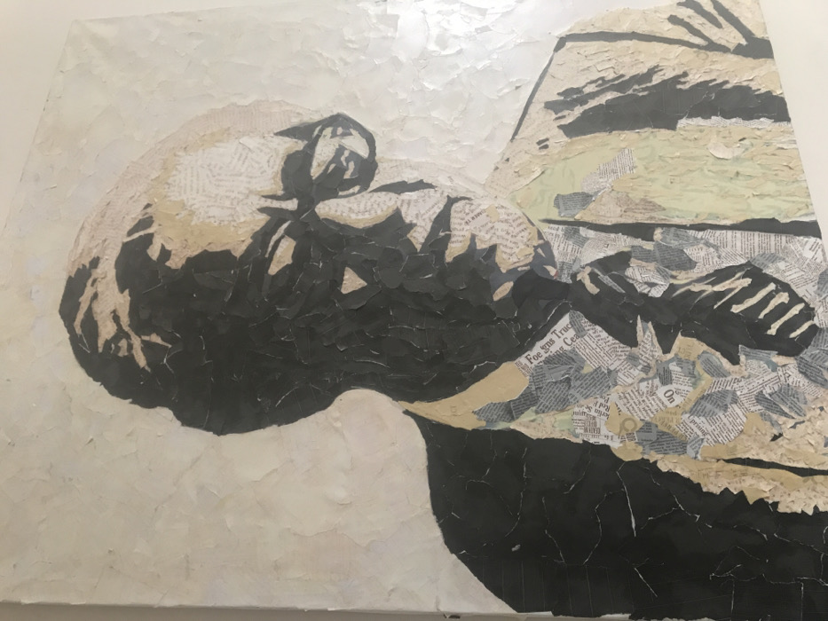 This image depicts a photograph of a mixed-media collage art piece, located in the city of Jibb as-Safa, Syria