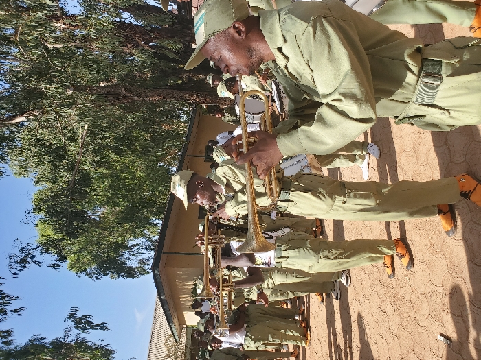 An outdoor scene in Jos, Nigeria, depicts approximately 15-20 individuals, predominantly young males, arranged in a band formation. The subjects are dressed in light green/khaki-colored National Youth Service Corps (NYSC) uniforms, consisting of button-up shirts with pockets, cargo trousers, and matching caps. Many wear distinctive bright orange-brown laced boots, while others have white sneakers or dark sandals. In the foreground and midground, at least five individuals are actively playing gold-colored brass instruments, specifically trumpets or cornets, held to their mouths. Their hands are positioned on the instrument valves and slides. A partial view of a white snare drum is visible on the far right. The individuals are standing upright, facing generally towards the left of the frame. The ground surface consists of reddish-brown interlocking concrete pavers, showing some signs of wear and dust. In the background, to the left, a single-story building with light-colored walls and a dark, possibly corrugated, roofline is visible. Behind and above the subjects, numerous mature trees with dense green foliage are prominent against a clear, bright blue sky. The scene is illuminated by strong natural sunlight, indicating daytime conditions.