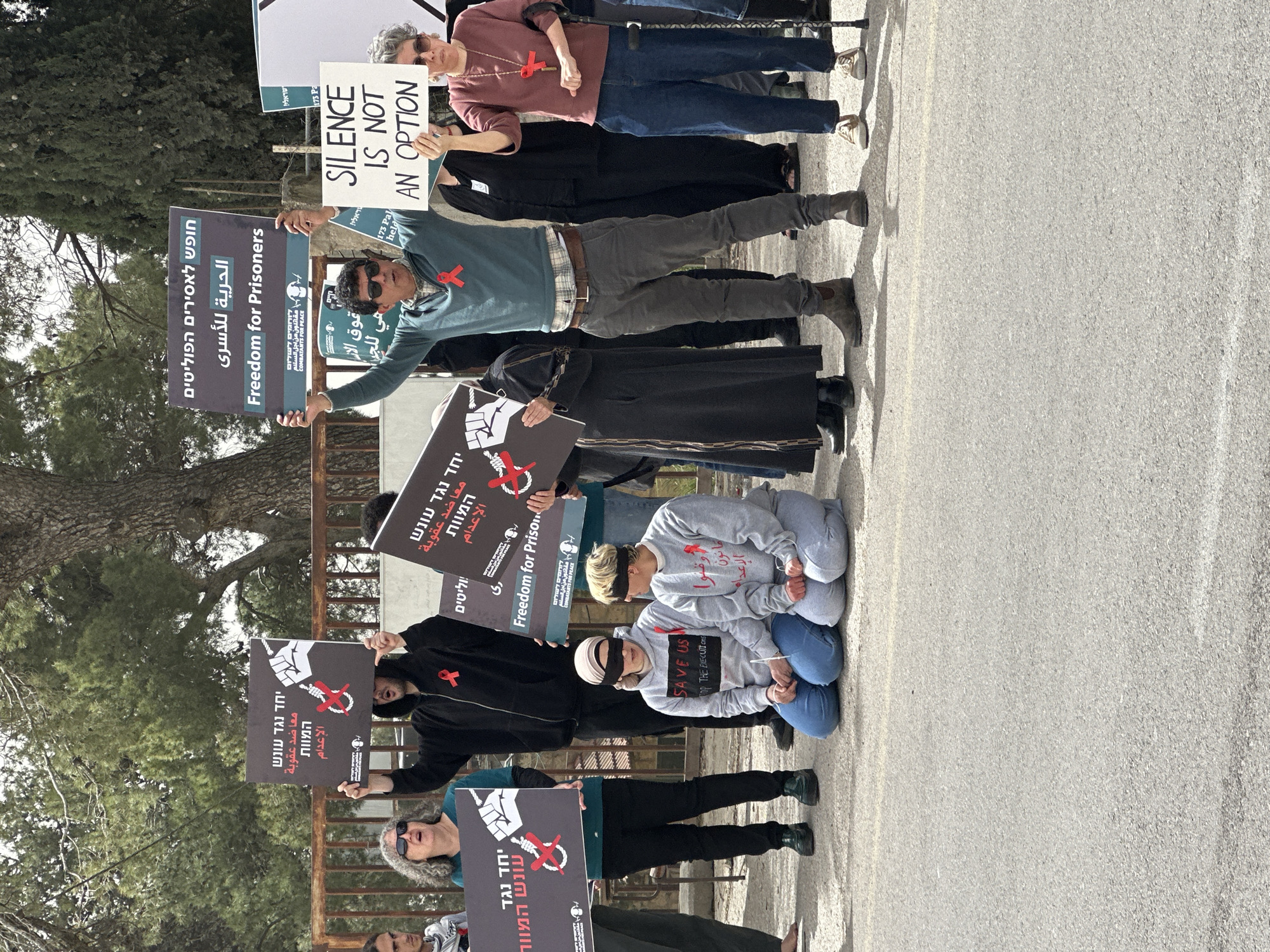 A group of people are standing on a paved road in front of a metallic fence with trees in the background. They are holding signs protesting for the freedom of prisoners and against the death penalty. Some of the signs are written in Hebrew and Arabic, with English translations provided for "Freedom for Prisoners." Two people in the middle are kneeling, with their hands appearing to be bound and their eyes covered, perhaps to symbolize the plight of prisoners. All the protesters are wearing red ribbons. The protesters are in line along the road. The image seems to be taken during the day.