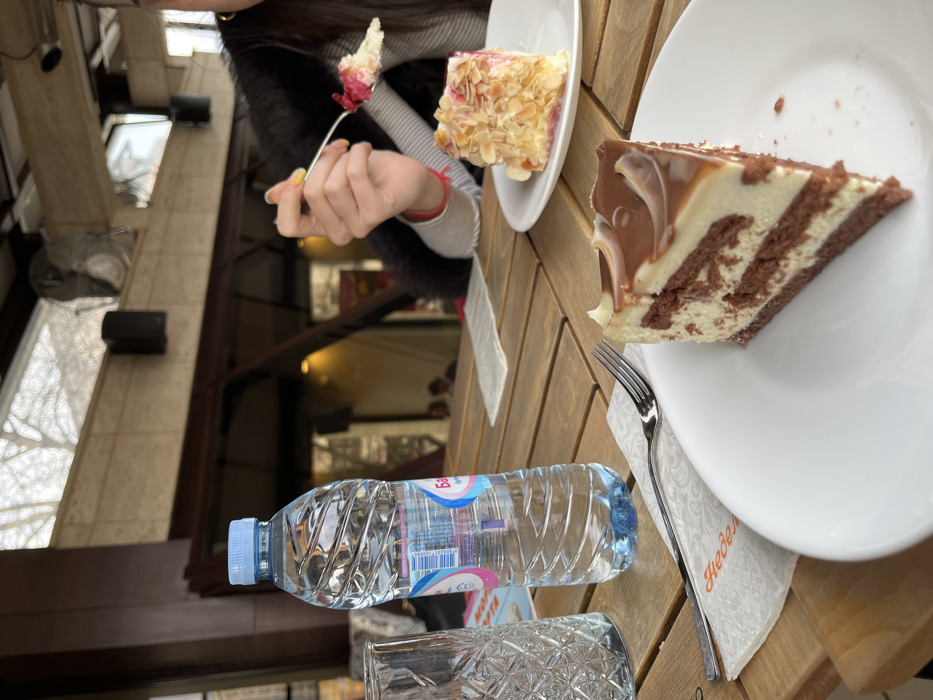 The image depicts an outdoor or semi-outdoor seating area of a Nedelya pastry shop in Sofia, Bulgaria. A wooden table occupies the foreground and midground. On the table, from left to right, a clear glass with a textured pattern is partially visible. Next to it, a plastic bottle of Bachkovo mineral water with a light blue cap stands upright. A silver fork rests on a white napkin bearing the "Неделя" (Nedelya) logo. In the lower right foreground, a slice of layered chocolate and cream cake with a swirled chocolate and caramel topping is presented on a white round plate. Further back and to the right, a second white plate holds a slice of cream-based cake topped with flaked almonds and a red fruit garnish. A person, partially visible on the right, wearing a grey long-sleeved top and a dark, possibly fur, vest, is in the process of eating; their right hand, adorned with a red bracelet and a yellow-painted fingernail, holds a silver fork with a piece of the almond-topped cake elevated towards their mouth. The background features structural elements of the establishment, including wooden beams, a speaker, and a fan, with blurred views of bare tree branches and other patrons indicating daylight conditions.
