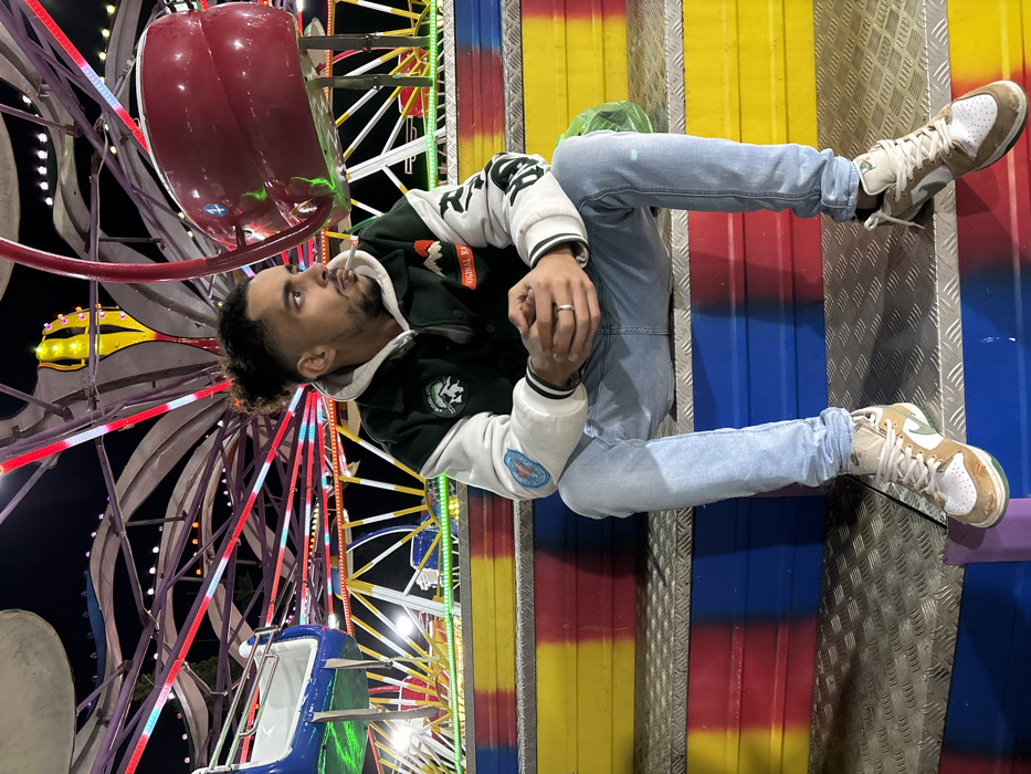 A man stands sideways at an amusement park. He wears a green and white jacket, light blue jeans, and tan sneakers. He looks to the left, toward a Ferris wheel with vibrant colored lights and a red bucket seat. The man stands on a colorful platform, striped with yellow, blue, and red. The background is dark, emphasizing the illuminated Ferris wheel.