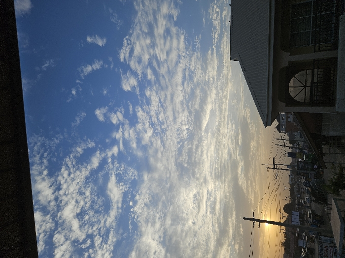 A sunrise bathes a bustling cityscape in a warm golden light. Power lines stretch across the scene, silhouetted against the vibrant sky, while buildings rise in the background. Above, fluffy white clouds drift through a bright blue sky, creating a striking contrast with the lower portion of the image. The sun shines directly at the bottom of the image. The top-right of the image shows a building.
