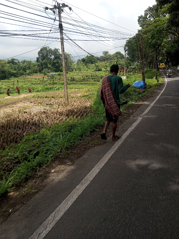 The scene depicts a rural area in Khajuripada, India, under an overcast sky. A single individual, seen from behind, walks northbound along the asphalt shoulder of a two-lane road. This person wears a dark green long-sleeved shirt, dark shorts, and open-toed sandals. A patterned maroon and brown cloth is draped over their left shoulder. The individual carries a light blue object in their right hand, held above the roadside vegetation. To the immediate left of the road, a strip of green grass borders a field of harvested crop stubble, likely rice paddy, which extends to terraced green fields and distant mountains. A wooden utility pole with numerous overhead wires stands prominently between the road and the fields. To the right of the road, a dense line of trees flanks the pavement. Further down the road, a yellow vehicle and a scooter with two occupants are visible.