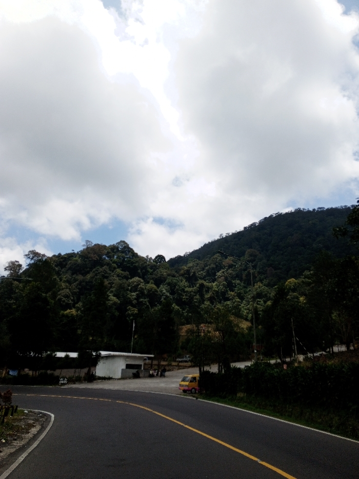 The image depicts an outdoor scene in a hilly, forested area, identified as Multhan, India, under a partly cloudy sky. A two-lane asphalt road with a solid yellow center line and a white edge marking curves from the lower-left foreground towards the mid-right. A large, densely forested mountain dominates the background and right side of the frame. To the left of the road, a low, single-story white building with a dark, flat roof is visible. A flagpole stands immediately in front of this building. A yellow mini-truck with pink accents is parked to the right of the white building, facing partially towards the road. A second, lighter-colored vehicle is partially visible behind the yellow mini-truck. Multiple indistinct human figures are present in the vicinity of the white building and the yellow mini-truck. A dark street light pole is positioned on the right side of the road, in front of the forested mountain. The environment suggests daytime with adequate natural illumination.