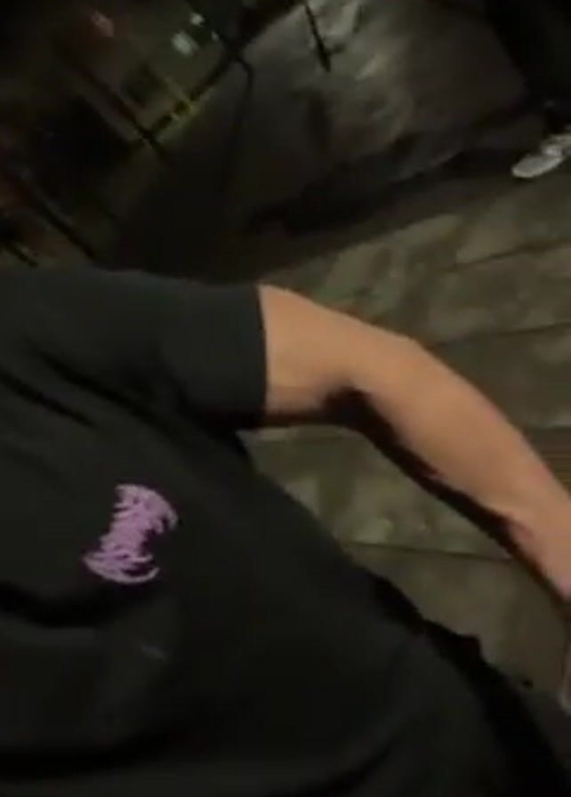 person wearing a black t-shirt with a purple logo on it. The shirt also has some text at the bottom, that is not legible. The person has a tattoo on their left wrist. They are standing outside at night, possibly on a paved area. There are streetlights providing illumination. There are buildings in the background. Another person's legs are briefly visible walking past. The video is shaky and taken from a low angle.