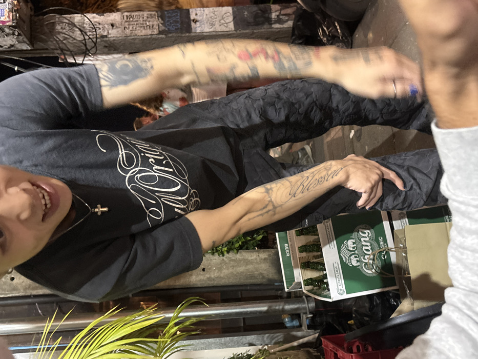 This image captures a candid street scene at night in Chiang Mai City Municipality, Thailand. The central subject is an individual with light skin, short dark hair, and a visible smile with an open mouth, leaning forward and looking slightly downward and to the left. The individual wears a dark, short-sleeved t-shirt with "All Original" in white script, dark patterned trousers, and a silver chain with a cross pendant. Both forearms display multiple tattoos, including the word "Blessed" in script on the inner left forearm. The fingernails on the subject's left hand are painted dark. To the left of the subject, two stacked cardboard cases of Chang Classic beer bottles are visible on the ground, accompanied by a partial red plastic crate and a brown paper bag. A concrete utility pole covered with stickers and graffiti, bearing electrical wires, is present on the right. Blurred figures are discernible in the background, and green foliage extends from the left frame. The ground appears to be a paved surface.