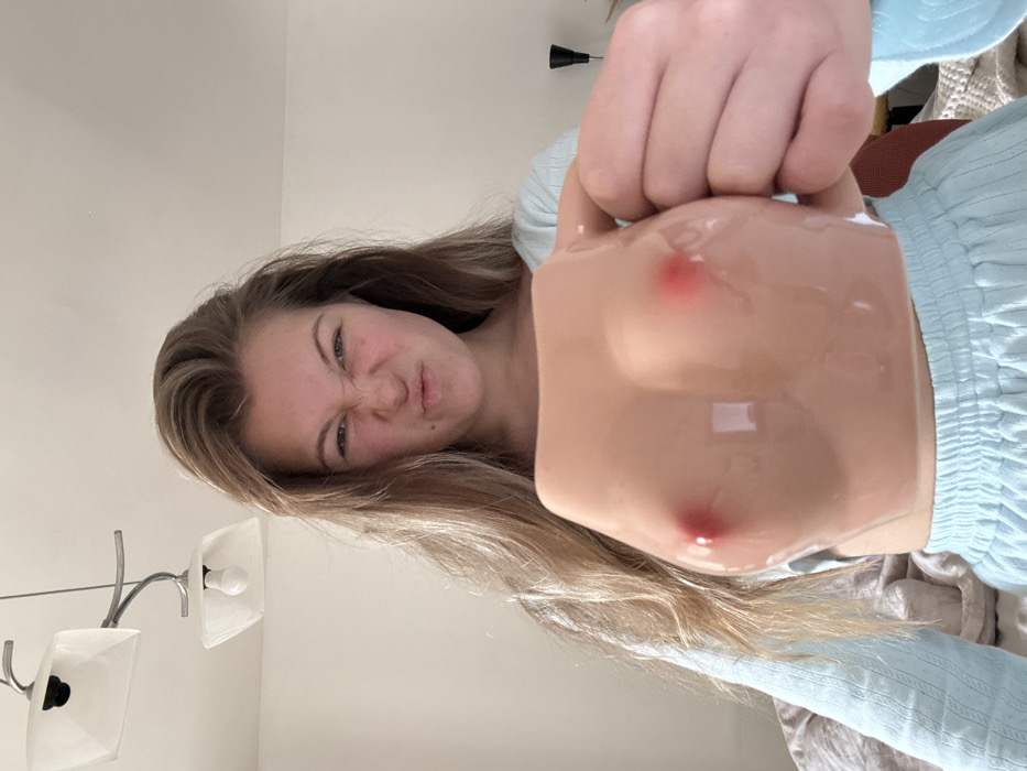 - "A fair-skinned woman with long blonde hair is holding a breast-shaped mug" by FM-7mF7g2, licensed under CC BY 4.0