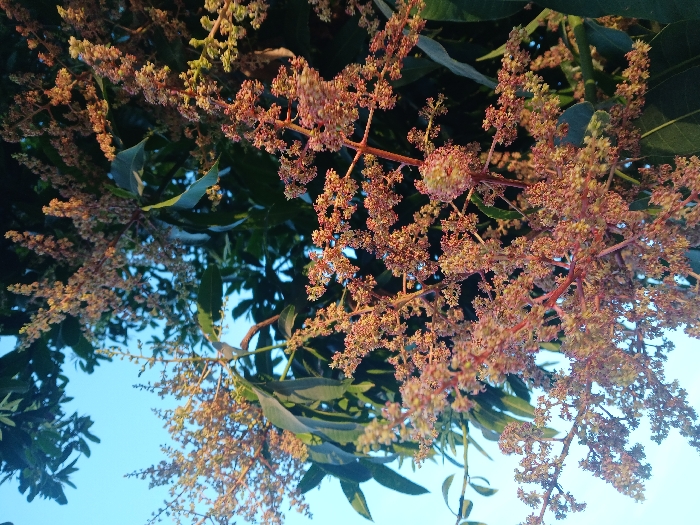 A close-up, upward-angled shot focuses on clusters of small, reddish-pink flowers attached to red-brown branches. Green leaves are visible, interspersed among the flowers and branches. The background reveals a bright, light blue sky. The lighting highlights the flower details, creating a slightly warm tone. The image suggests a blossoming tree against a clear sky.