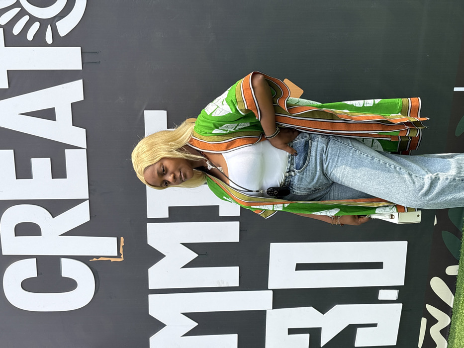 A female individual stands in front of a dark gray wall with large white lettering, identified as the "Creator Summit 3.0" event, located in Itirin, Nigeria. She has long, blonde hair and fair skin. She is dressed in a white tank top, light wash wide-leg denim jeans, and an open, green, orange, and white patterned kimono-style jacket. Accessories include a dark necklace with a silver-colored pendant (stylized animal head), a black lanyard with a dark oval object, and multiple bracelets on both wrists. She holds a small white structured handbag in her left hand, which is partially out of frame. Her right hand is placed on her hip, and she is looking to her left, away from the camera. A small section of green ground with abstract white shapes is visible at the bottom of the frame.
