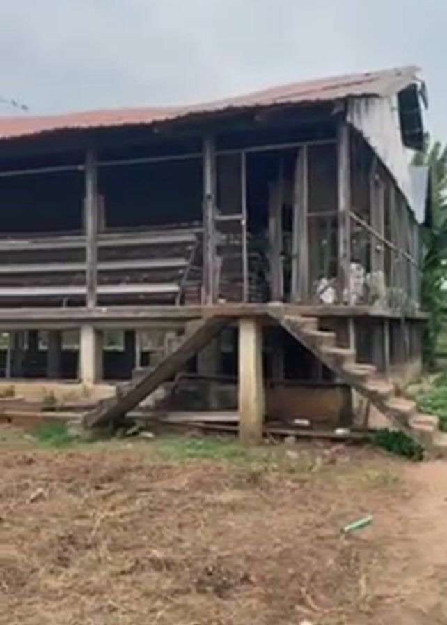 n exterior view of a large, weathered chicken coop in a rural setting. The coop is built on a raised platform with multiple tiers of cages visible through the screen walls. A set of stairs leads up to the entrance. The surrounding area is a mix of bare dirt and sparse vegetation. In the background, there are banana trees and other plants. The sky is overcast. The camera slowly zooms in on the chicken coop. Someone states that the coop is home to about 60,000 chickens.