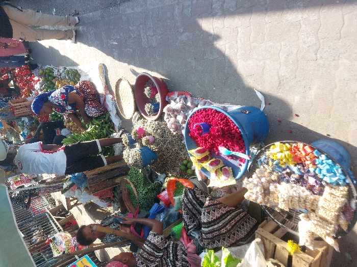 This image depicts an active open-air street market scene in Dar es-Salaam, Tanzania