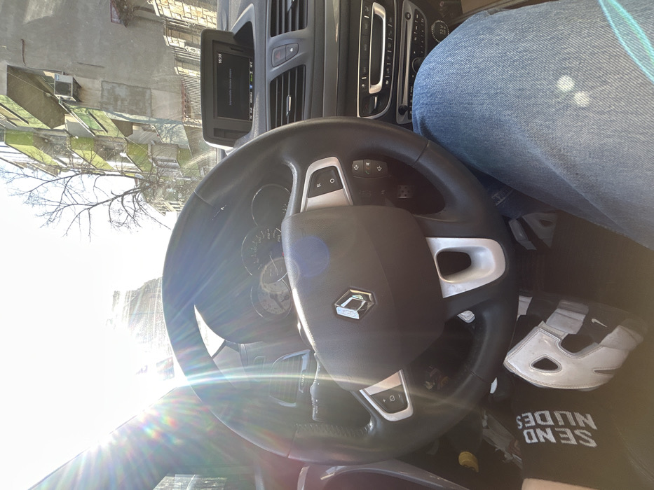 The image depicts the interior of a stationary vehicle, identified as a Renault by its steering wheel emblem, with a view through the windshield