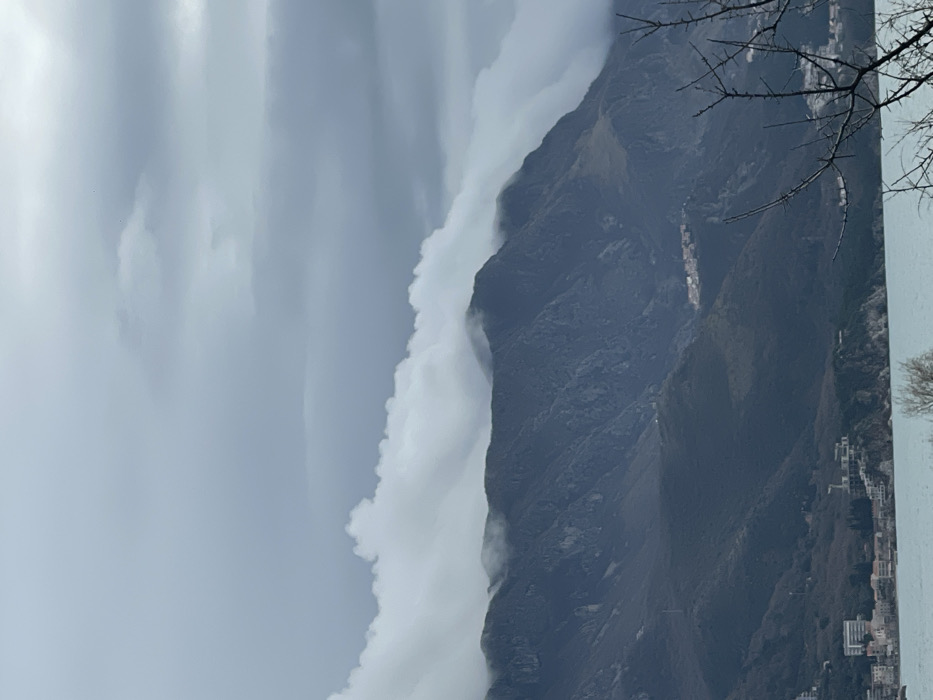 An overcast, wide-angle landscape photograph depicts a mountainous coastal region identified as Boreti, Montenegro, under a heavily clouded sky. Dominant dark, rugged mountains occupy the midground, their peaks partially obscured by dense, white, layered clouds that appear to flow from right to left, cresting over the mountain ridges. Below the main mountain range, on a mid-level slope towards the right-center, a small cluster of light-colored buildings forms a distinct village settlement. Further left, at the base of the mountains along a coastline, a larger urban area with numerous buildings, including multi-story structures, extends along the shore. A calm, muted blue-green body of water, consistent with a sea or large bay, occupies the lower third of the image. The immediate foreground, particularly on the right and left, shows bare, thorny branches of deciduous vegetation, suggesting a winter or late autumn season. No individuals or specific actions are discernible within the frame.