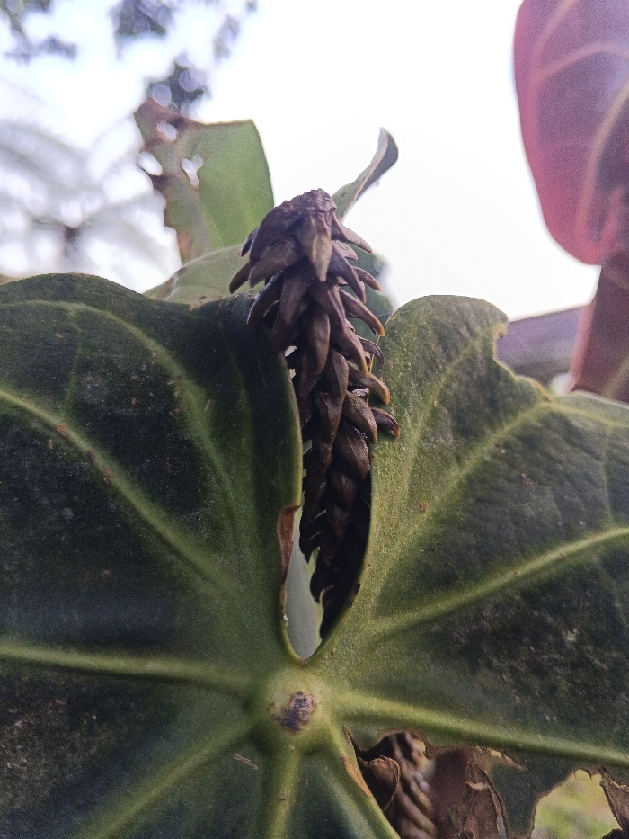 The scene is located in Tobanda, Sierra Leone, and presents a close-up, vertical composition of botanical elements under natural, diffuse light. A prominent, elongated, dark brown, segmented botanical structure, characterized by overlapping, scale-like units, occupies the central vertical axis. This structure is positioned against and partially visible through an irregular, U-shaped tear or puncture in the blade of a large, deep green leaf. The leaf exhibits distinct central and radiating secondary veins, a matte surface texture, and minor imperfections. Additional blurred green foliage is visible to the immediate left and behind the primary leaf, with a hint of blurred reddish-brown plant material on the far right edge of the frame. The upper background is brightly illuminated and entirely out-of-focus, consistent with an overcast sky or diffuse daylight conditions. No human subjects, animals, or man-made objects are present.